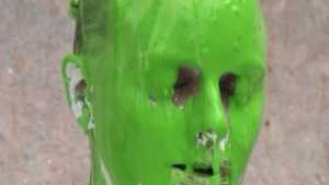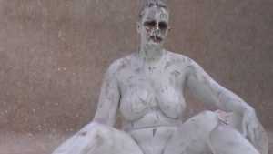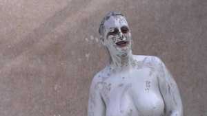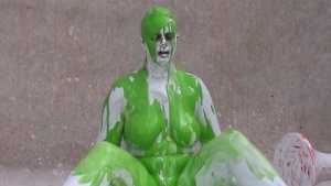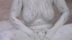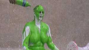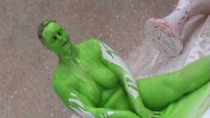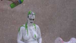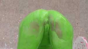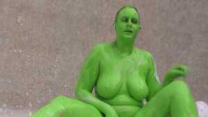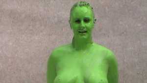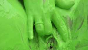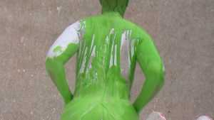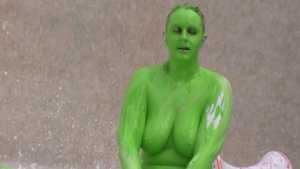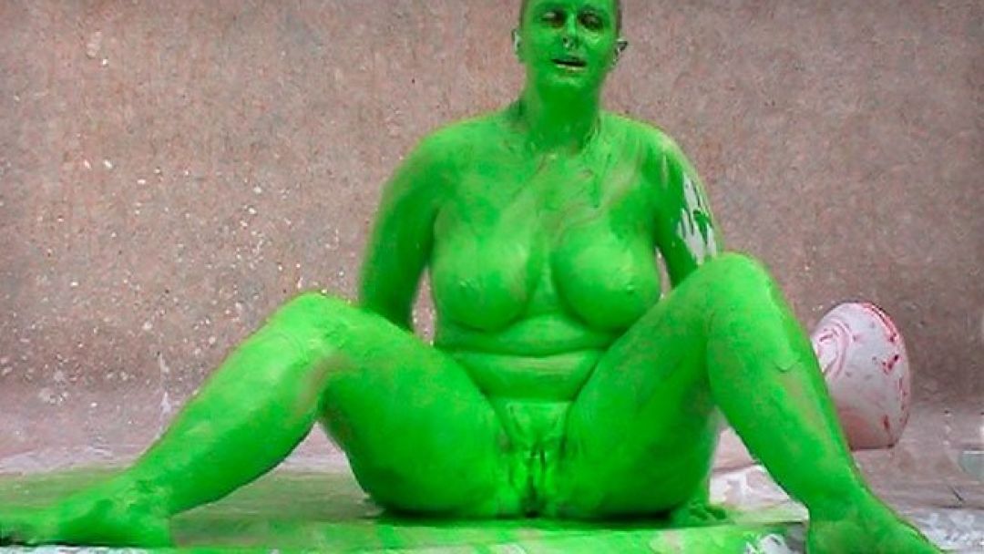 Video2: Sara is entirely naked and after white paint, she is completely sprayed with green paint... She has a lot of sensuality, generous and sensuous curves of her body are very exciting.