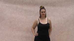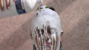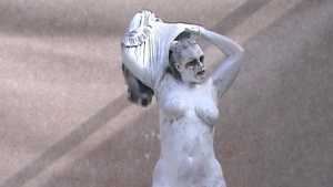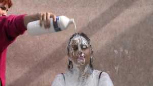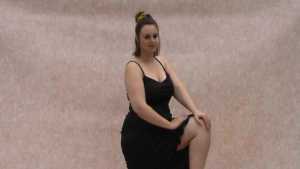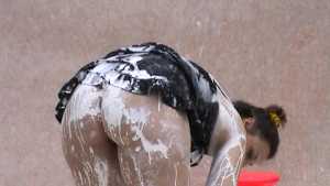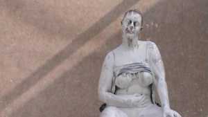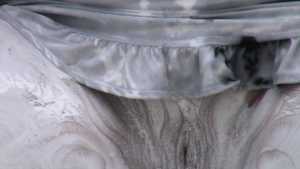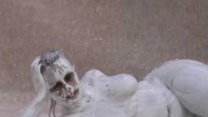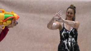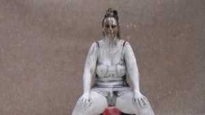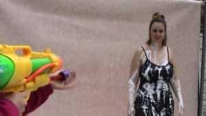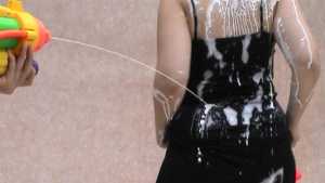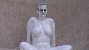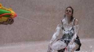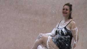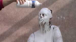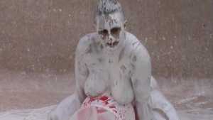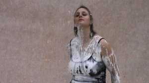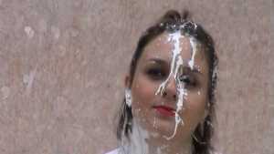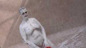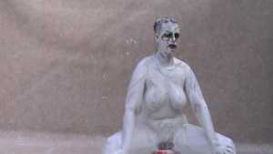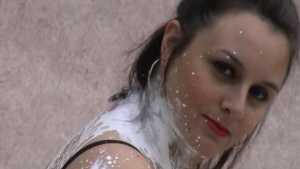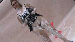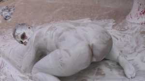Video1: Sara, dressed in a black evening dress is covered with white paint, sent to the gun. She ends spotted completely naked in white.