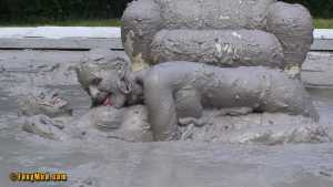 - they take their time before getting completely covered. I love that. A lot of my fun comes from the anticipation of getting a piece muddy. Love that this gets stretch for a longer tease, yet super playful and engaging. On that note they wash off before things get heated again. The wash off makes their t-shirts see-through and then they go back at each other :)
